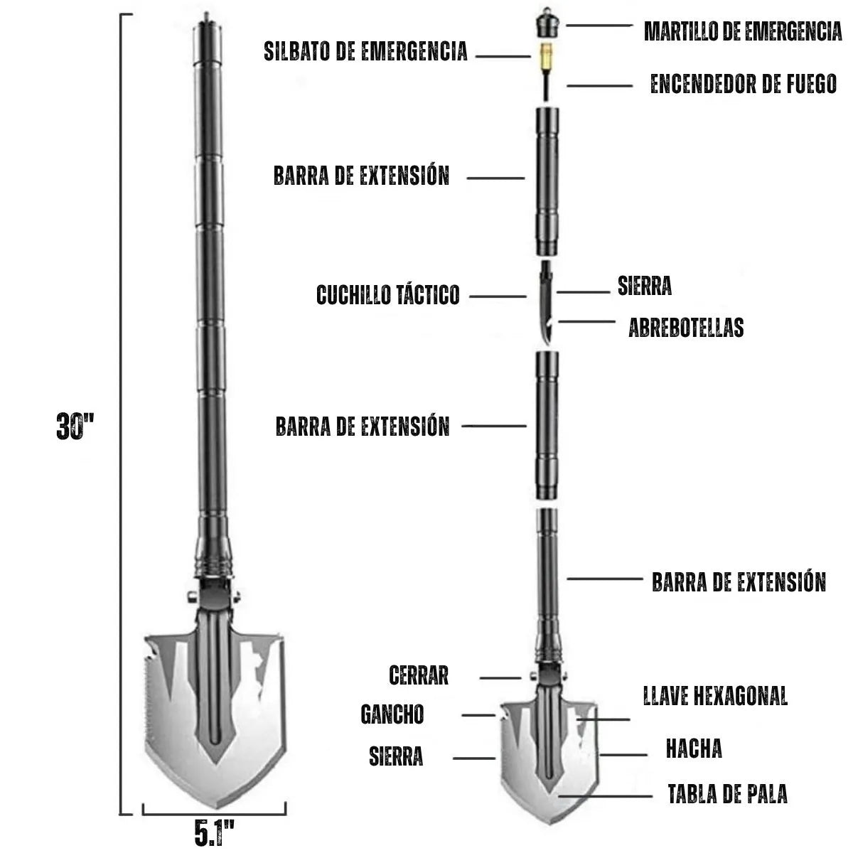 - Funciones: pala, hacha, sierra, cuchillo con sierra, rompevidrios, pedernal, silbato, destapador y 3 llaves hex.